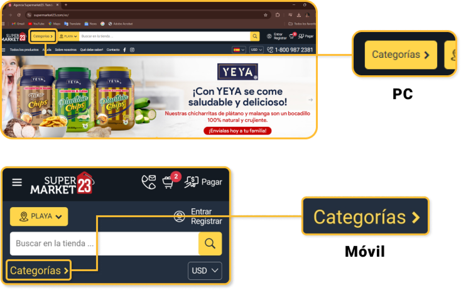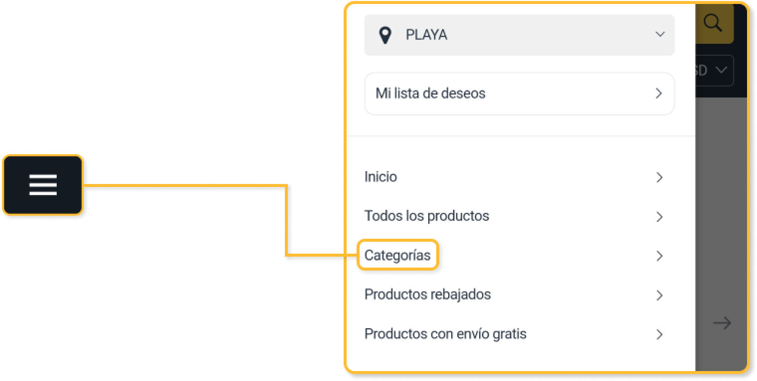 - También puede acceder a las categorías de productos a través del ícono de menú (Tres líneas horizontales) en la parte superior izquierda de la página.