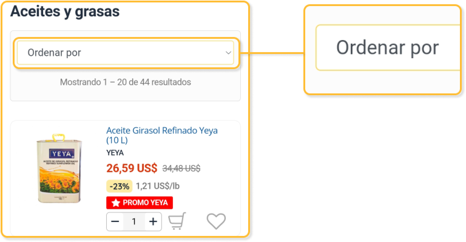 Utilice los filtros "Ordenar por" para sus búsquedas. Podrá ordenar la categoría o productos según las siguientes opciones: menor precio, mayor precio, más nuevo o menor precio/lb.
