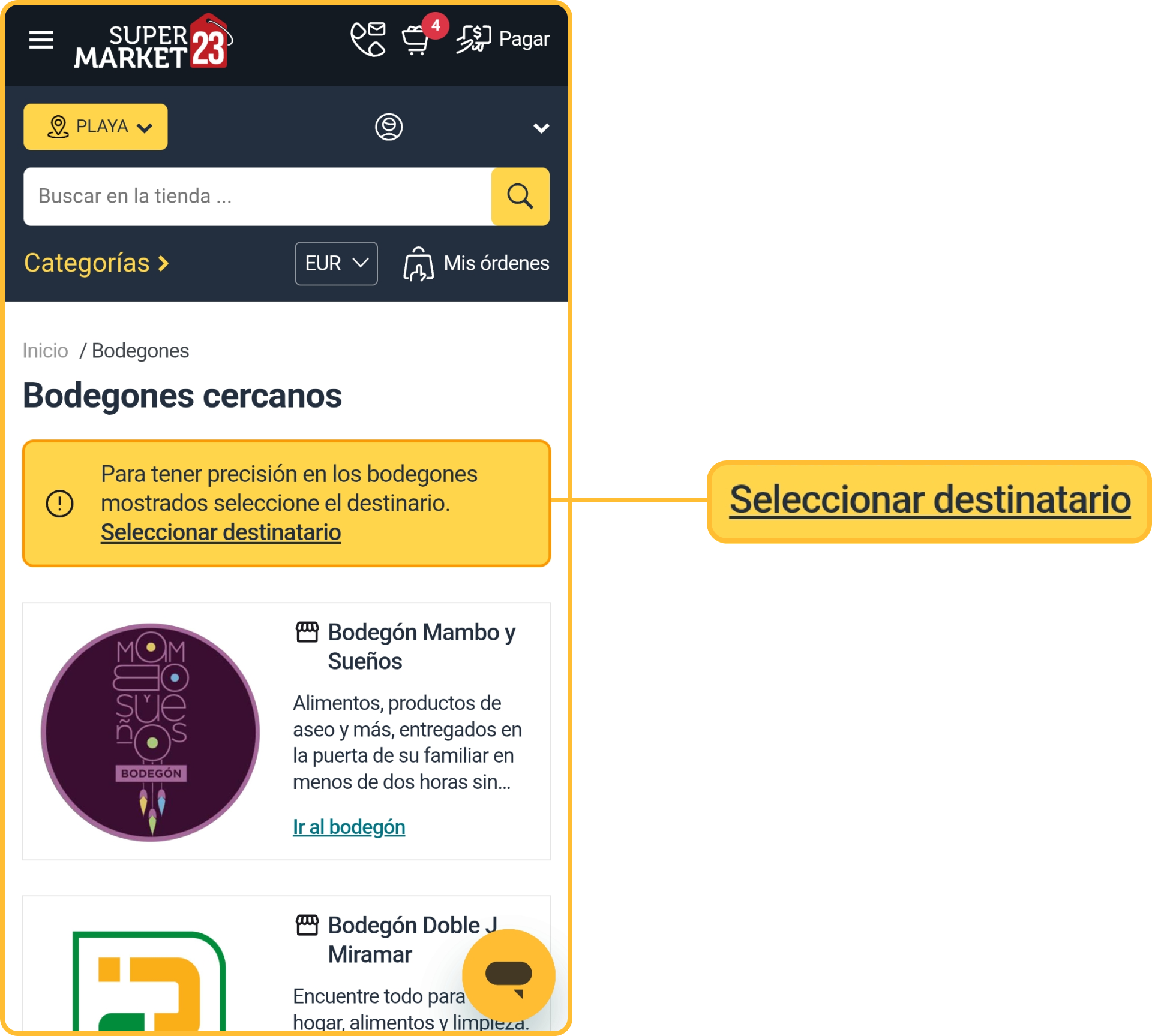 - Seleccione un destinatario ya guardado, o cree uno nuevo, para ver los Bodegones disponibles en su área. Aségurese de proporcionar la dirección correcta (calle + número de la casa o edificio, apartamento, entre calles adyacentes, barrio o reparto, municipio, provincia), de lo contrario no encontrará bodegones disponibles para la compra.